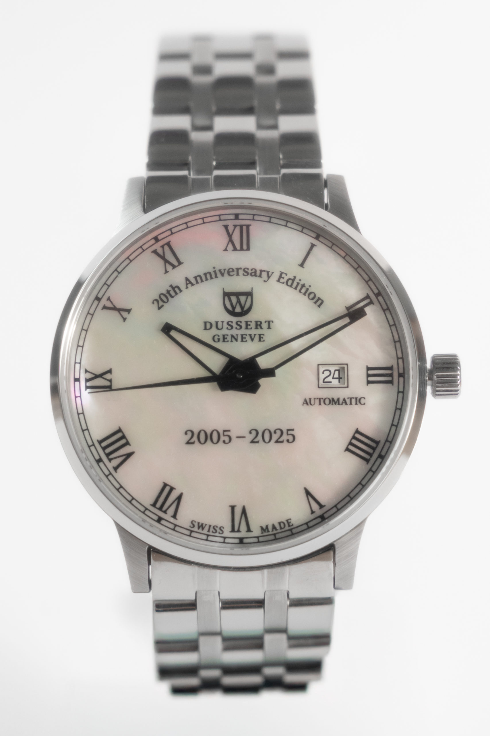 AUTOMATIQUE 3 aiguilles, boîte 316L Polie/Satinée diamètre 41mm, épaisseur 10mm, fond avec glace, cadran NACRE spécial anniversaire, glace saphir, mouvement AUTOMATIQUE ETA 2824-2, Selitta SW200, étanche 5 ATM (50m), bracelet silicone, cuire original ou métal. Série limitée à 20 montres.